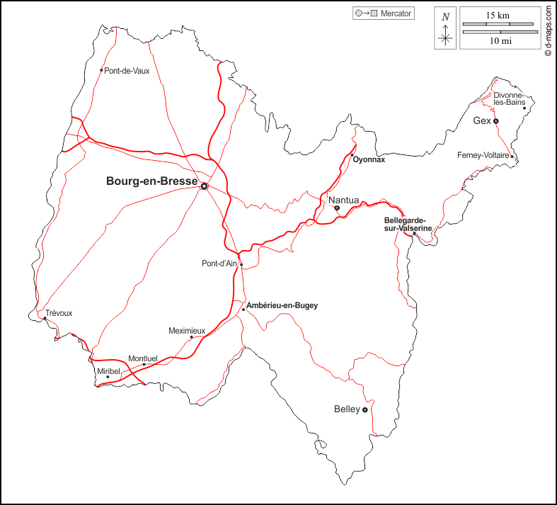 d-maps > यूरोप > फ़्रान्स > ऐन > बाह्यरेखा, मुख्य शहरों, सड़कों, नाम, सफेद