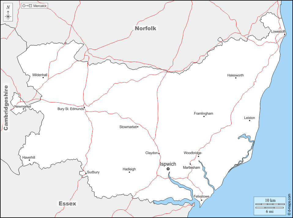 d-maps > यूरोप > युनाइटेड किंगडम > सफ़क > सीमाओं, मुख्य शहरों, सड़कों, नाम