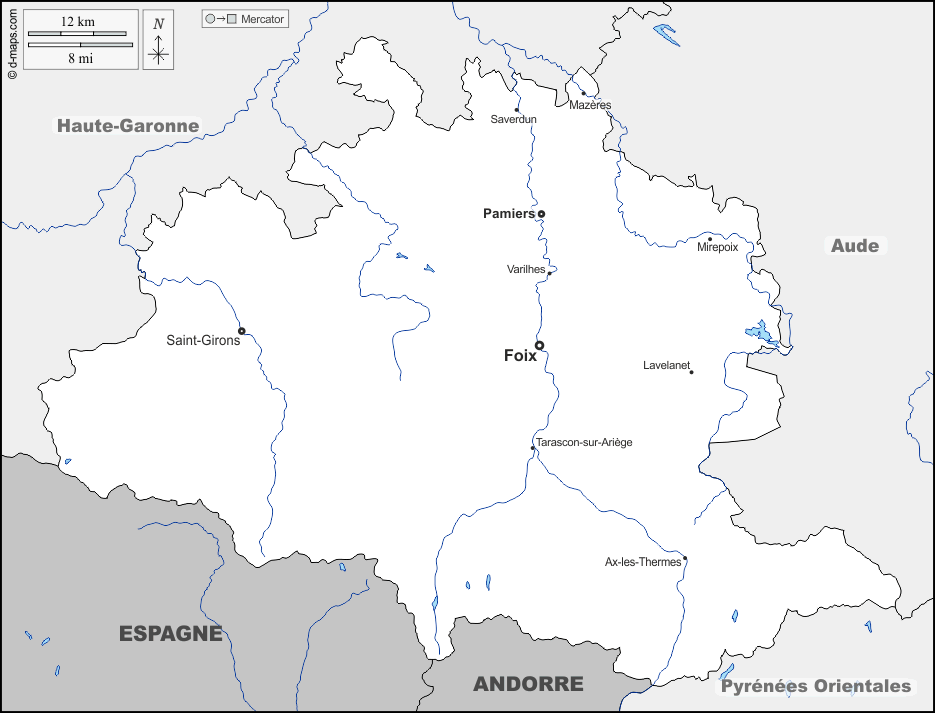 d-maps > यूरोप > फ़्रान्स > अरिगे > सीमाओं, जल-सर्वेक्षण, मुख्य शहरों, नाम
