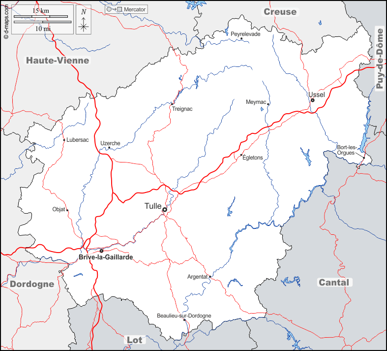 d-maps > यूरोप > फ़्रान्स > कोर्रेज़ > सीमाओं, जल-सर्वेक्षण, मुख्य शहरों, सड़कों, नाम