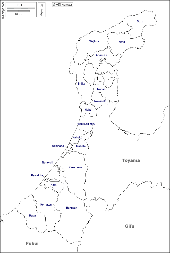 d-maps > एशिया > जापान > इशिकावा > सीमाओं, नगर पालिकाओं, नाम, सफेद