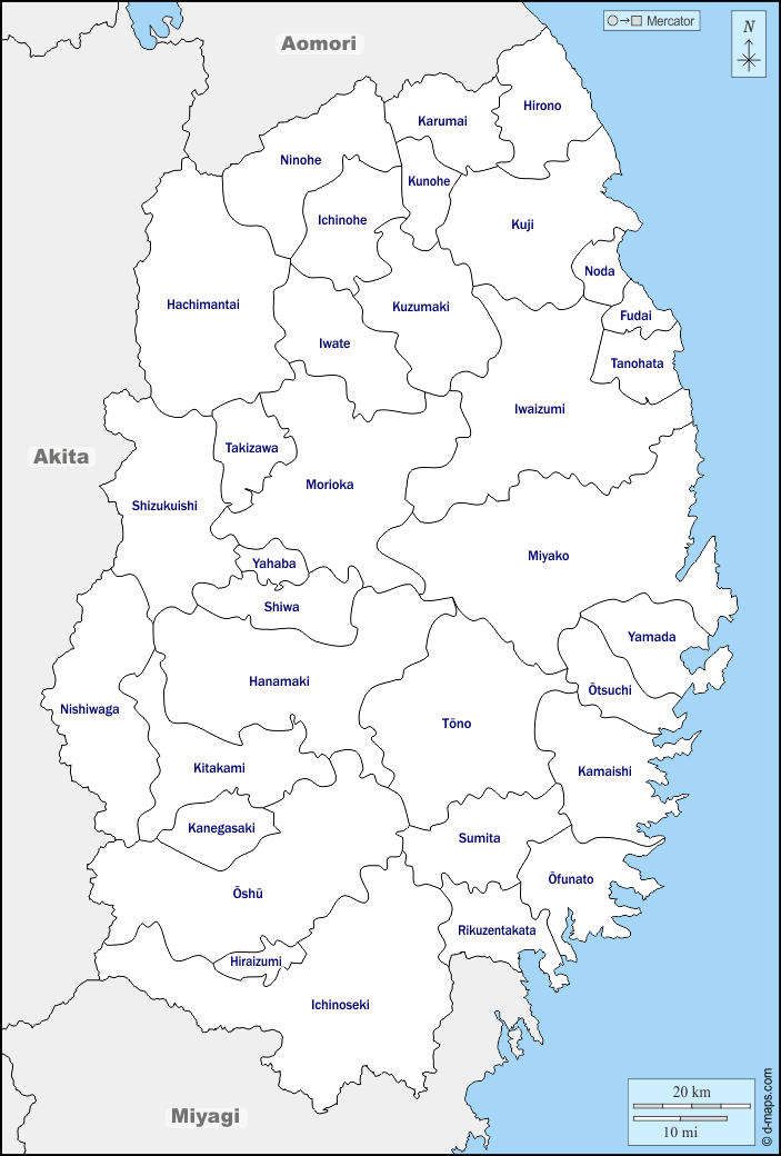 d-maps > एशिया > जापान > इवाते प्रीफ़ेक्चर > सीमाओं, नगर पालिकाओं, नाम