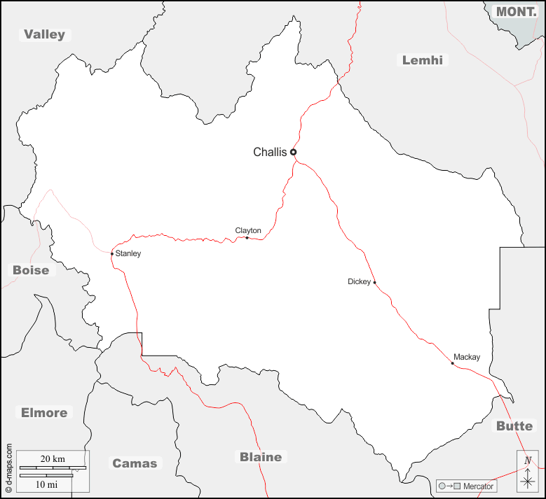 d-maps > संयुक्त राज्य > इडाहो > कस्टर काउंटी > सीमाओं, मुख्य शहरों, सड़कों, नाम