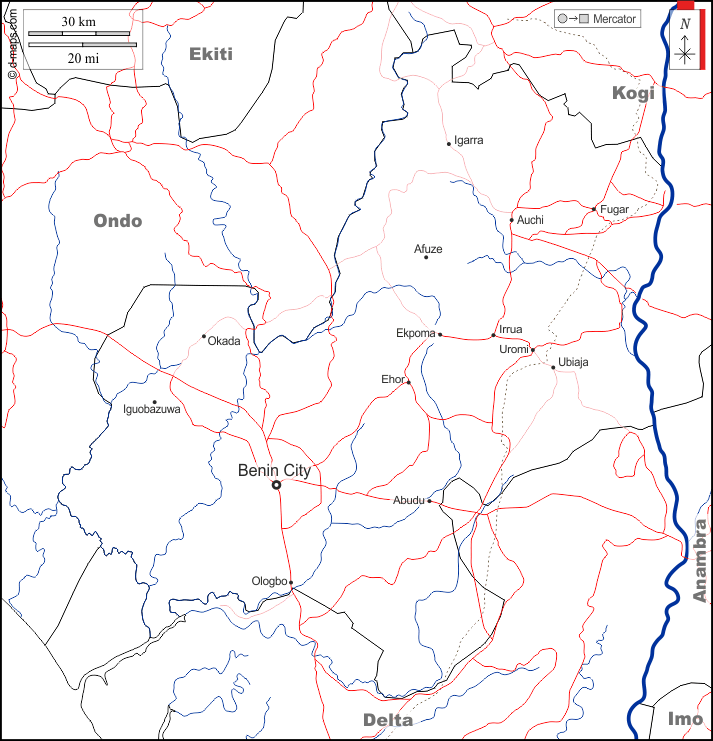 d-maps > अफ्रीका > नाइजीरिया > एडो राज्य > सीमाओं, जल-सर्वेक्षण, मुख्य शहरों, सड़कों, नाम, सफेद