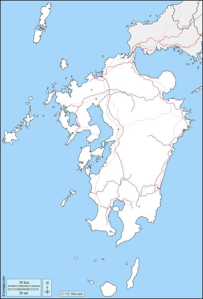 d-maps > एशिया > जापान > क्यूशू > सीमाओं, जल-सर्वेक्षण, मुख्य शहरों, सड़कों