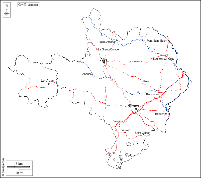 d-maps > यूरोप > फ़्रान्स > गार्ड > बाह्यरेखा, जल-सर्वेक्षण, मुख्य शहरों, सड़कों, नाम, सफेद