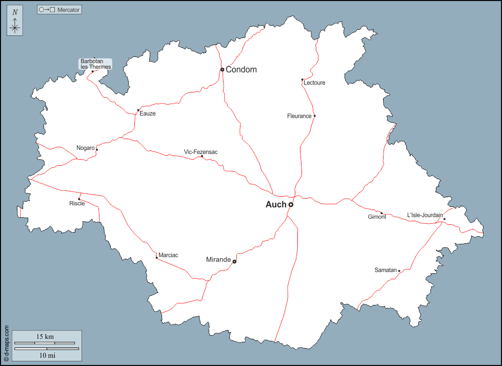 d-maps > यूरोप > फ़्रान्स > जेर्स > बाह्यरेखा, मुख्य शहरों, सड़कों, नाम