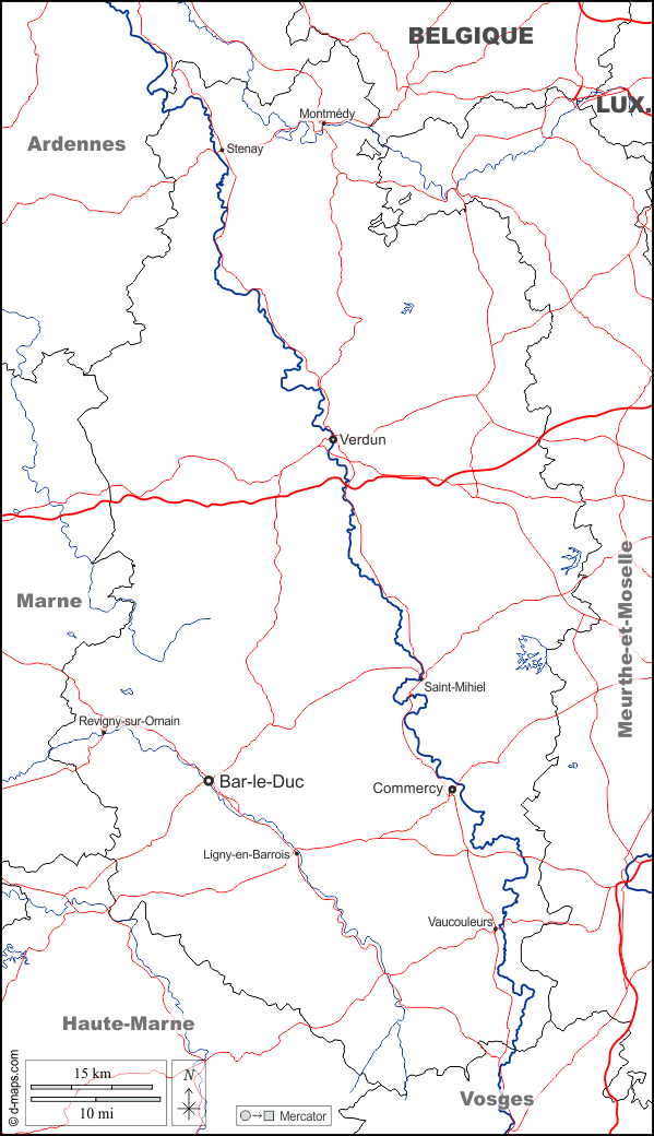 d-maps > यूरोप > फ़्रान्स > मीस > सीमाओं, जल-सर्वेक्षण, मुख्य शहरों, सड़कों, नाम, सफेद