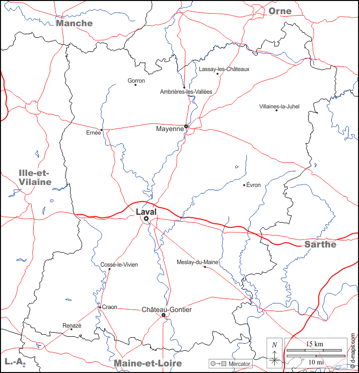 d-maps > यूरोप > फ़्रान्स > मायेन > सीमाओं, जल-सर्वेक्षण, मुख्य शहरों, सड़कों, नाम, सफेद