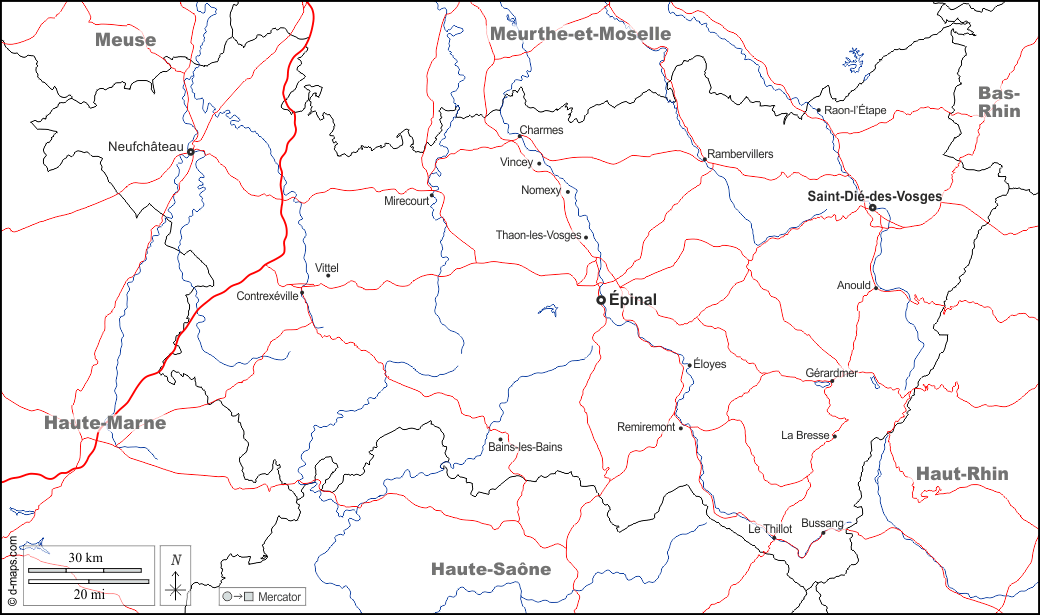 d-maps > यूरोप > फ़्रान्स > वोसगेस > सीमाओं, जल-सर्वेक्षण, मुख्य शहरों, सड़कों, नाम, सफेद