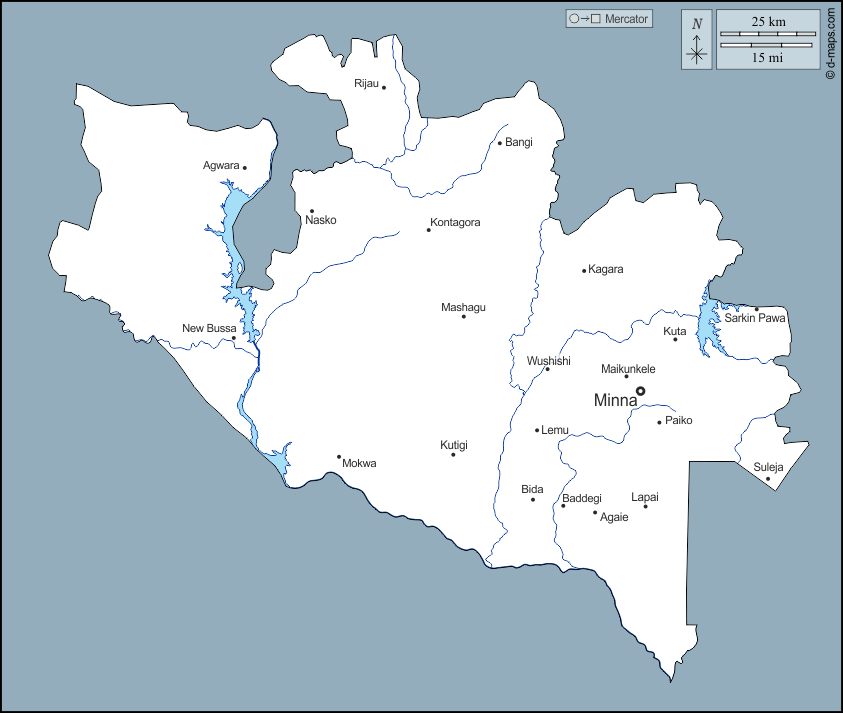 d-maps > अफ्रीका > नाइजीरिया > नाइजर राज्य > बाह्यरेखा, जल-सर्वेक्षण, मुख्य शहरों, नाम
