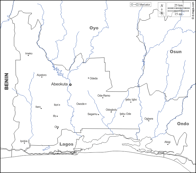 d-maps > अफ्रीका > नाइजीरिया > ओगुन > सीमाओं, जल-सर्वेक्षण, मुख्य शहरों, नाम, सफेद