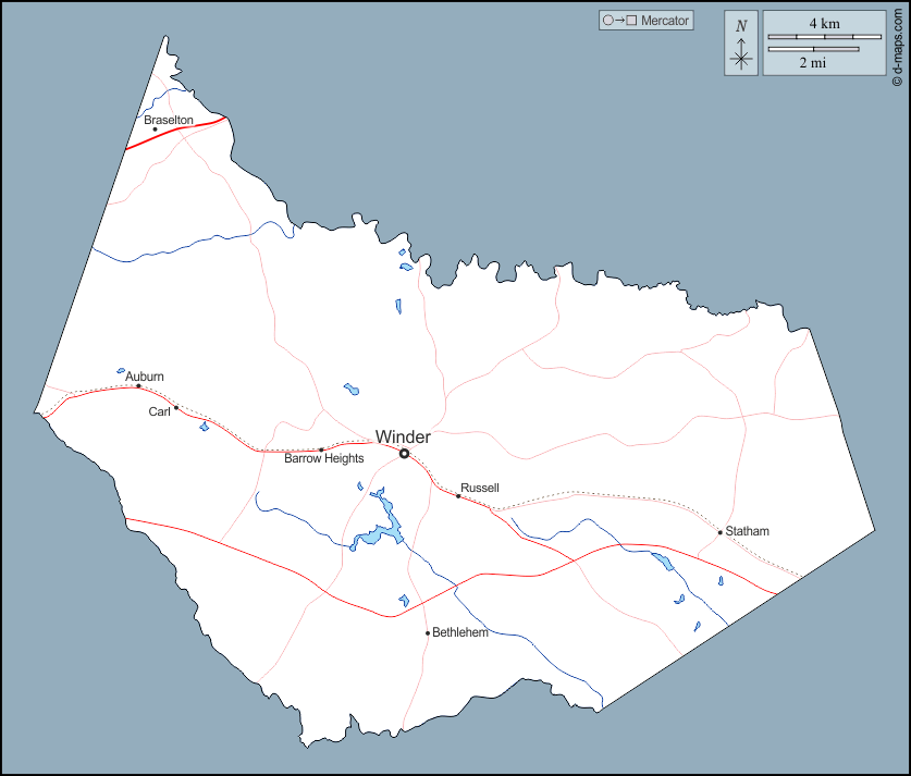 d-maps > संयुक्त राज्य > जॉर्जिया > बैरो काउंटी > बाह्यरेखा, जल-सर्वेक्षण, मुख्य शहरों, सड़कों, नाम