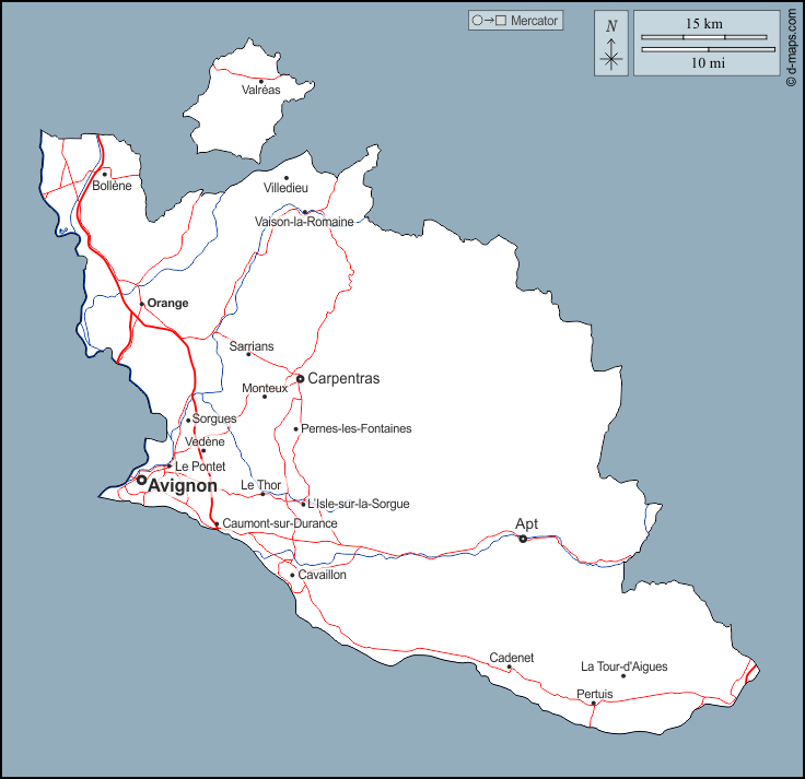 d-maps > यूरोप > फ़्रान्स > वाउक्लूस > बाह्यरेखा, जल-सर्वेक्षण, मुख्य शहरों, सड़कों, नाम
