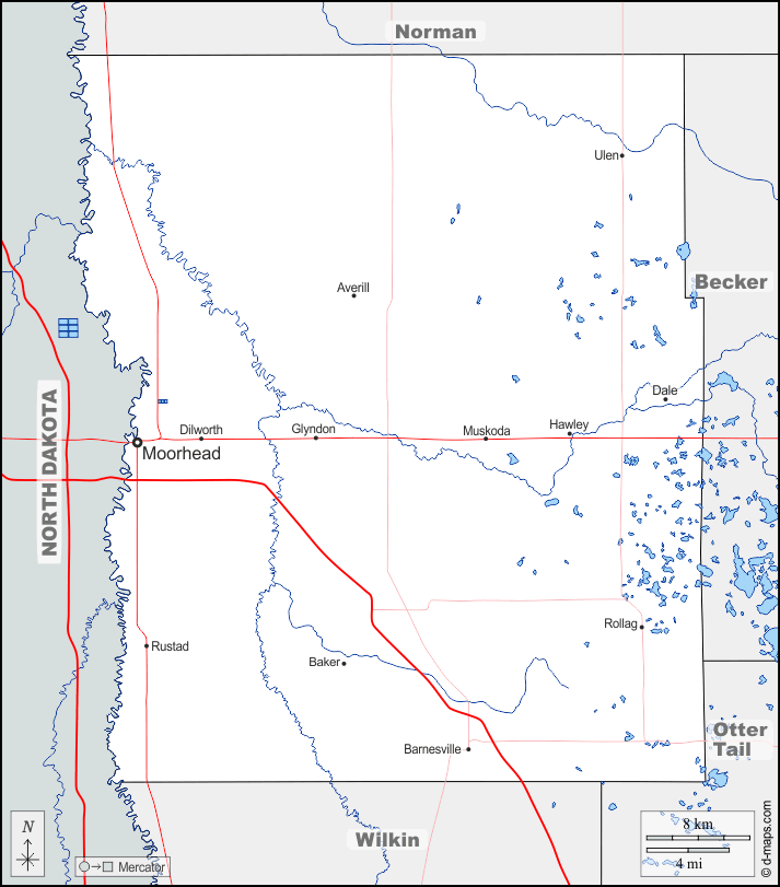 d-maps > संयुक्त राज्य > मिनेसोटा > क्ले काउंटी > सीमाओं, जल-सर्वेक्षण, मुख्य शहरों, सड़कों, नाम