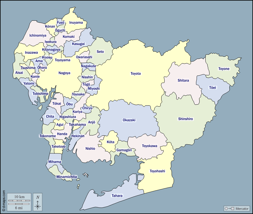 d-maps > एशिया > जापान > आइचीआइची प्रीफ़ेक्चर > बाह्यरेखा, नगर पालिकाओं, नाम, रंग
