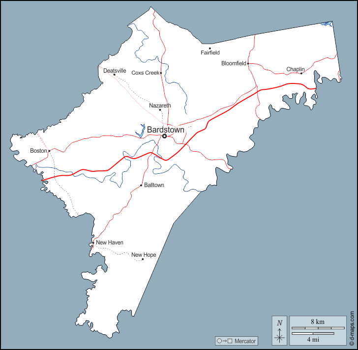 d-maps > संयुक्त राज्य > केंटुकी > नेल्सन काउंटी > बाह्यरेखा, जल-सर्वेक्षण, मुख्य शहरों, सड़कों, नाम