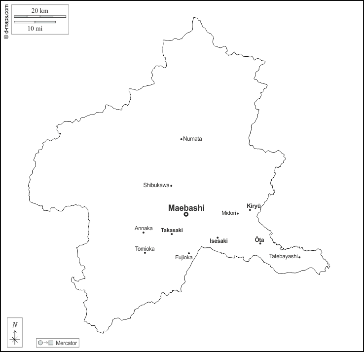 d-maps > एशिया > जापान > गुनमा > बाह्यरेखा, मुख्य शहरों, नाम, सफेद