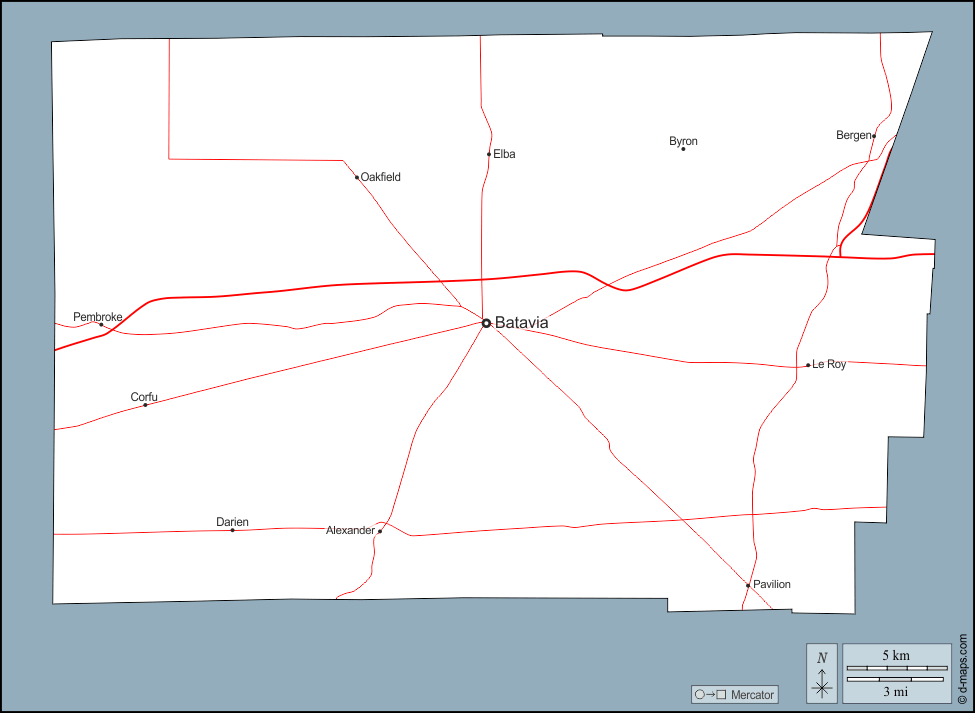 d-maps > संयुक्त राज्य > न्यू यॉर्क > जेनेसी काउंटी > बाह्यरेखा, मुख्य शहरों, सड़कों, नाम