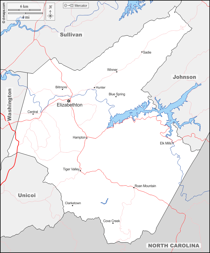 d-maps > संयुक्त राज्य > टेनेसी > कार्टर काउंटी > सीमाओं, जल-सर्वेक्षण, मुख्य शहरों, सड़कों, नाम