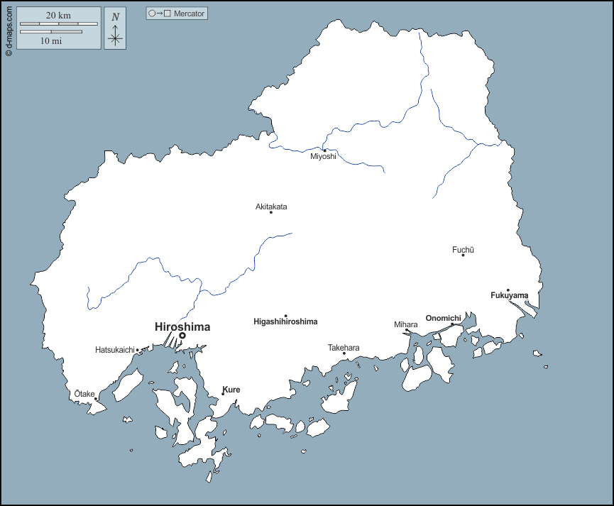 d-maps > एशिया > जापान > हिरोशिमा > बाह्यरेखा, जल-सर्वेक्षण, मुख्य शहरों, नाम