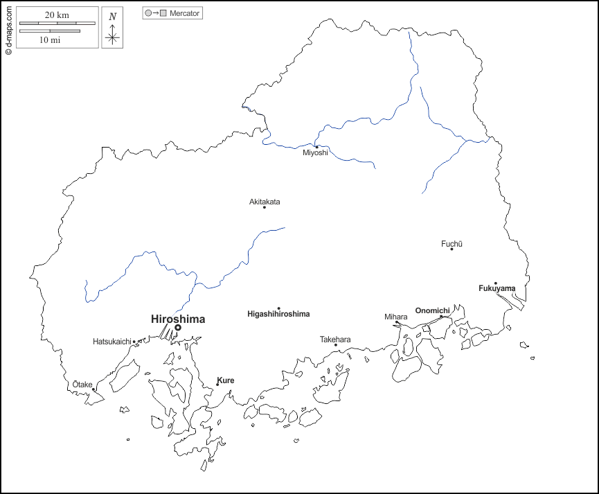 d-maps > एशिया > जापान > हिरोशिमा > बाह्यरेखा, जल-सर्वेक्षण, मुख्य शहरों, नाम, सफेद