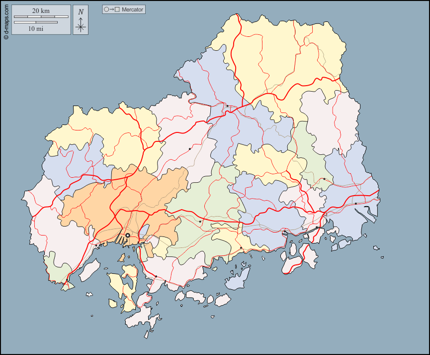 d-maps > एशिया > जापान > हिरोशिमा > बाह्यरेखा, नगर पालिकाओं, मुख्य शहरों, सड़कों, रंग