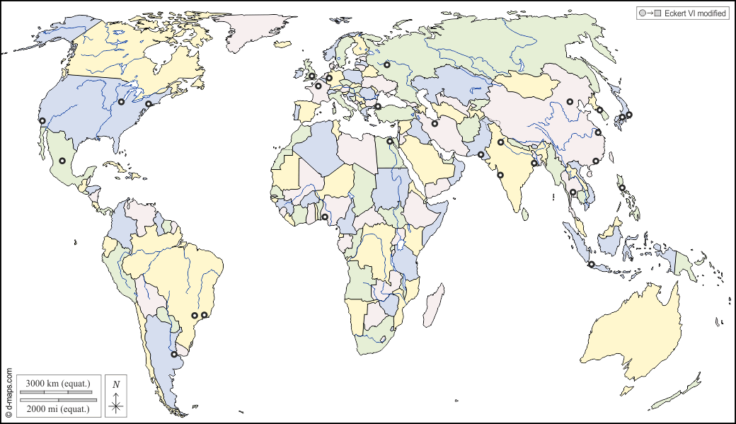 विश्व प्लैनिस्फीयर (यूरोप अफ्रीका) : मुख्य कस्बों