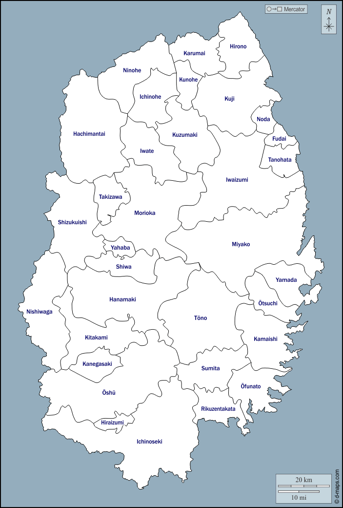 d-maps > एशिया > जापान > इवाते प्रीफ़ेक्चर > बाह्यरेखा, नगर पालिकाओं, नाम