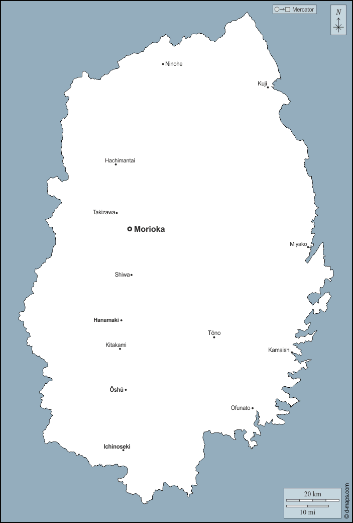 d-maps > एशिया > जापान > इवाते प्रीफ़ेक्चर > बाह्यरेखा, मुख्य शहरों, नाम