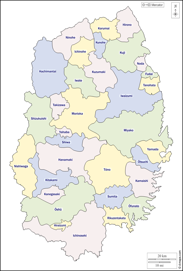 d-maps > एशिया > जापान > इवाते प्रीफ़ेक्चर > बाह्यरेखा, नगर पालिकाओं, नाम, रंग, सफेद