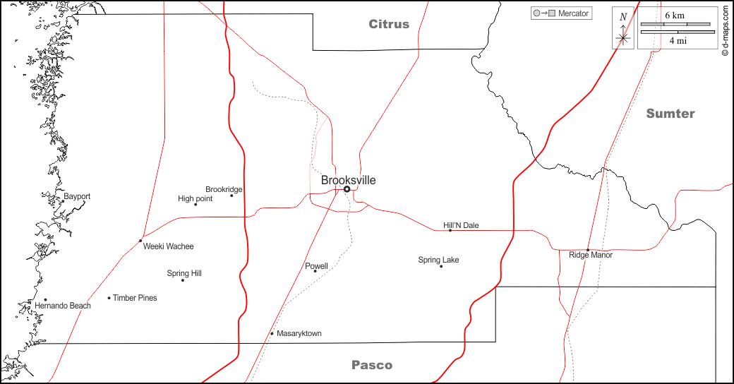 d-maps > संयुक्त राज्य > फ्लोरिडा > हर्नान्डो काउंटी > सीमाओं, मुख्य शहरों, सड़कों, नाम, सफेद