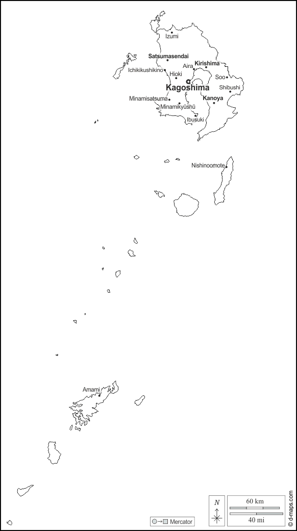 d-maps > एशिया > जापान > कागोशिमा > बाह्यरेखा, मुख्य शहरों, नाम, सफेद