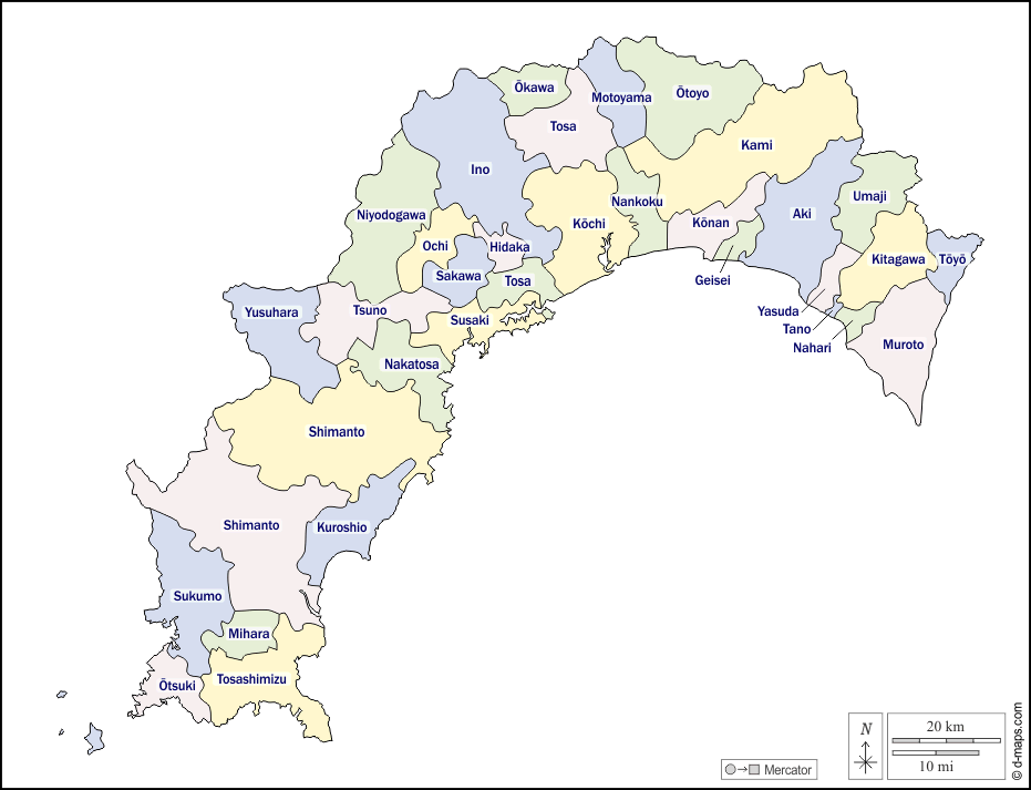 d-maps > एशिया > जापान > कोच्चि > बाह्यरेखा, नगर पालिकाओं, नाम, रंग, सफेद