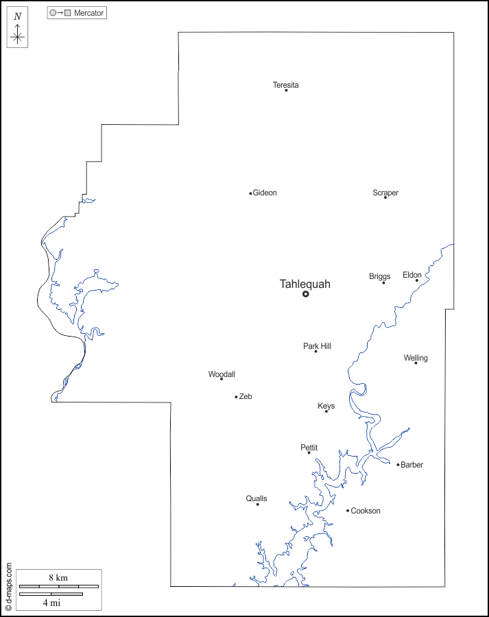 d-maps > संयुक्त राज्य > ओकलाहोमा > चेरोकी काउंटी > बाह्यरेखा, जल-सर्वेक्षण, मुख्य शहरों, नाम, सफेद