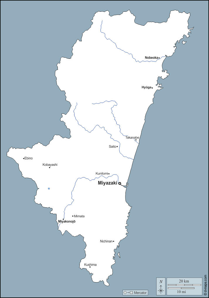 d-maps > एशिया > जापान > मियाज़ाकी > बाह्यरेखा, जल-सर्वेक्षण, मुख्य शहरों, नाम