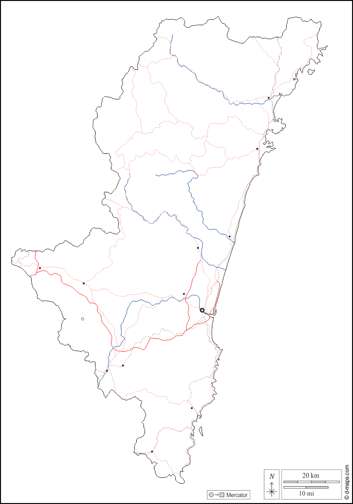 d-maps > एशिया > जापान > मियाज़ाकी > बाह्यरेखा, जल-सर्वेक्षण, मुख्य शहरों, सड़कों, सफेद