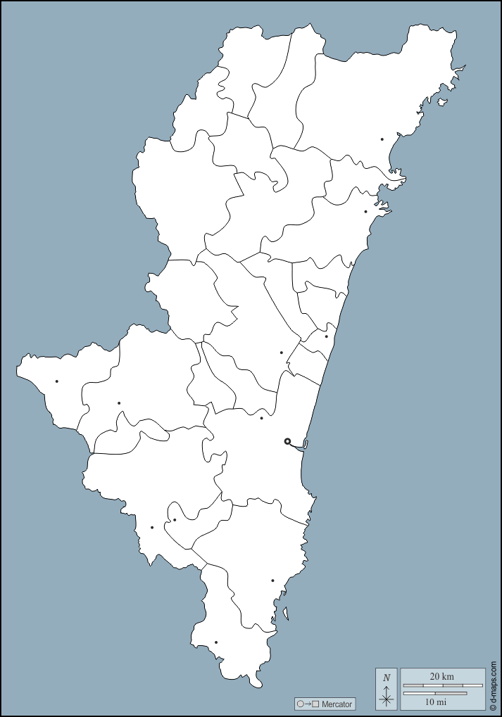 d-maps > एशिया > जापान > मियाज़ाकी > बाह्यरेखा, नगर पालिकाओं, मुख्य शहरों