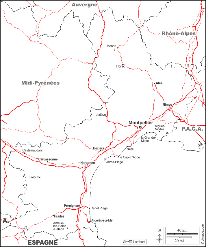 d-maps > यूरोप > फ़्रान्स > लांगडॉक-रूसीलॉन > सीमाओं, मुख्य शहरों, सड़कों, नाम, सफेद