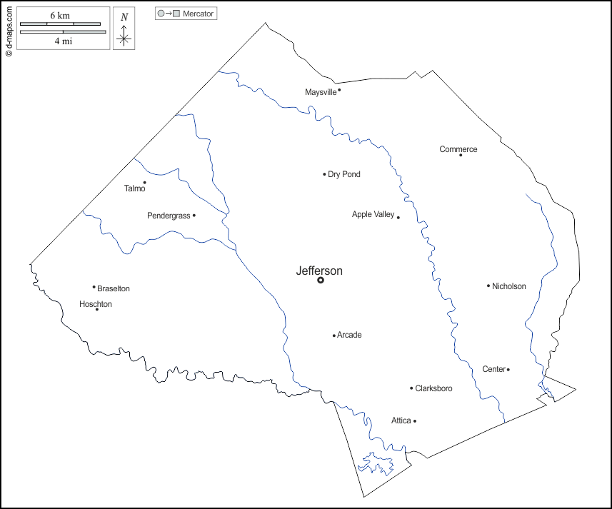 d-maps > संयुक्त राज्य > जॉर्जिया > जैक्सन काउंटी > बाह्यरेखा, जल-सर्वेक्षण, मुख्य शहरों, नाम, सफेद