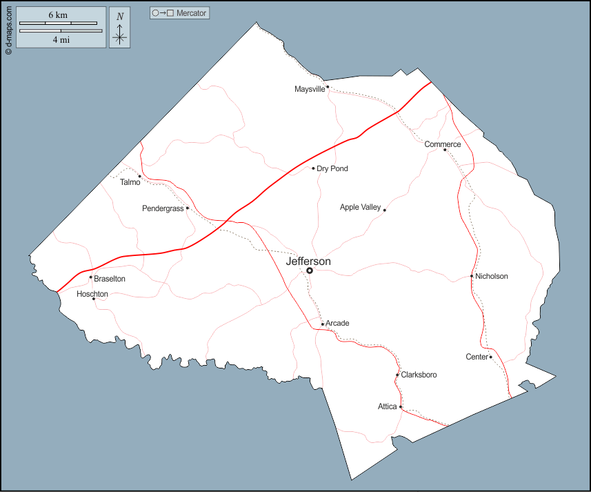 d-maps > संयुक्त राज्य > जॉर्जिया > जैक्सन काउंटी > बाह्यरेखा, मुख्य शहरों, सड़कों, नाम