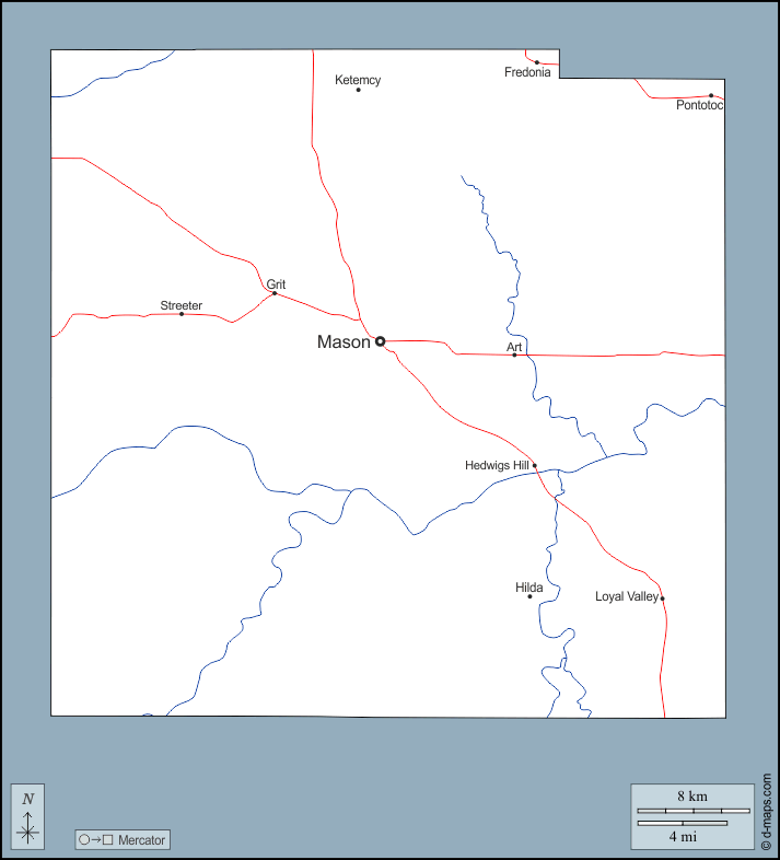 d-maps > संयुक्त राज्य > टेक्सास > मेसन काउंटी > बाह्यरेखा, जल-सर्वेक्षण, मुख्य शहरों, सड़कों, नाम