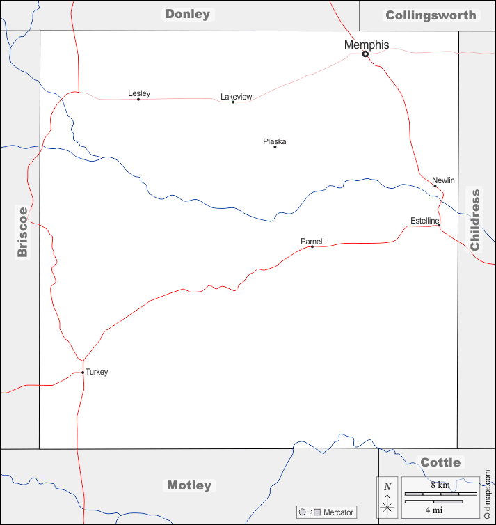 d-maps > संयुक्त राज्य > टेक्सास > हॉल काउंटी > सीमाओं, जल-सर्वेक्षण, मुख्य शहरों, सड़कों, नाम