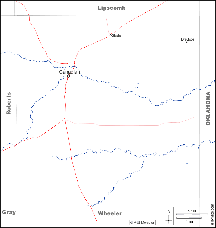 d-maps > संयुक्त राज्य > टेक्सास > हेमफिल काउंटी > सीमाओं, जल-सर्वेक्षण, मुख्य शहरों, सड़कों, नाम, सफेद