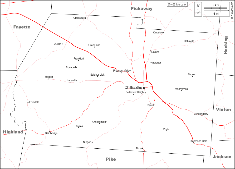 d-maps > संयुक्त राज्य > ओहायो > रॉस काउंटी > सीमाओं, मुख्य शहरों, सड़कों, नाम, सफेद
