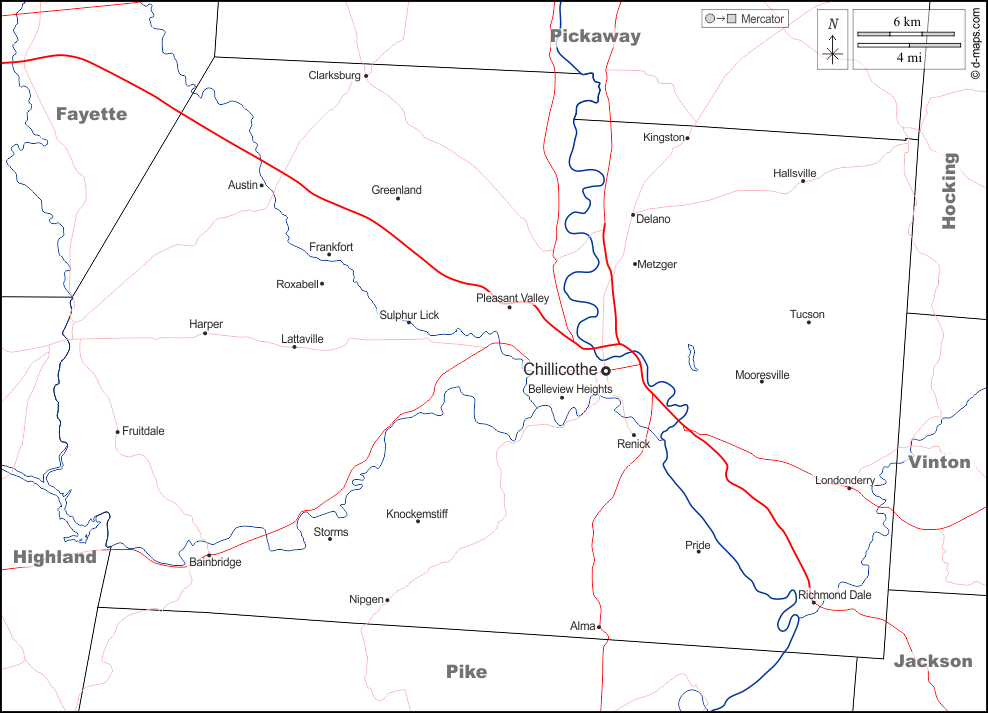 d-maps > संयुक्त राज्य > ओहायो > रॉस काउंटी > सीमाओं, जल-सर्वेक्षण, मुख्य शहरों, सड़कों, नाम, सफेद
