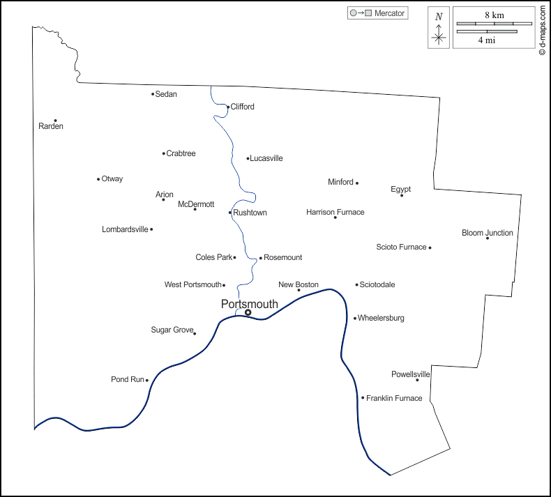 d-maps > संयुक्त राज्य > ओहायो > साइकोटो काउंटी > बाह्यरेखा, जल-सर्वेक्षण, मुख्य शहरों, नाम, सफेद