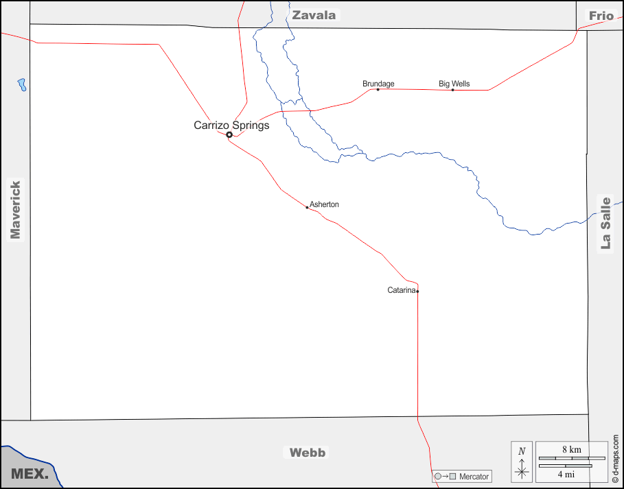 d-maps > संयुक्त राज्य > टेक्सास > डिमिट काउंटी > सीमाओं, जल-सर्वेक्षण, मुख्य शहरों, सड़कों, नाम