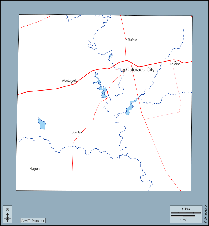 d-maps > संयुक्त राज्य > टेक्सास > मिशेल काउंटी > बाह्यरेखा, जल-सर्वेक्षण, मुख्य शहरों, सड़कों, नाम