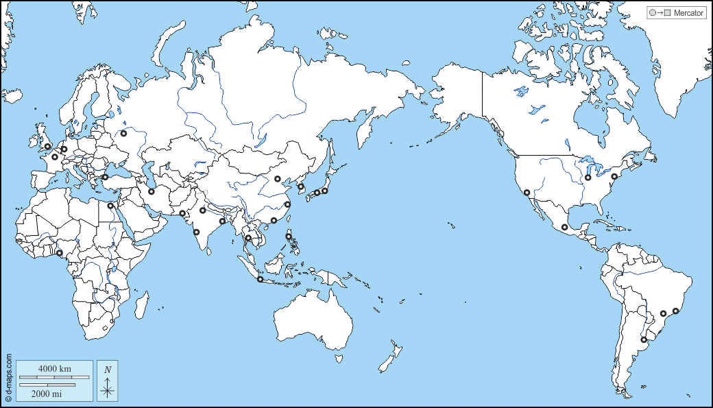 विश्व प्लैनिस्फीयर (प्रशांत महासागर) : मुख्य कस्बों